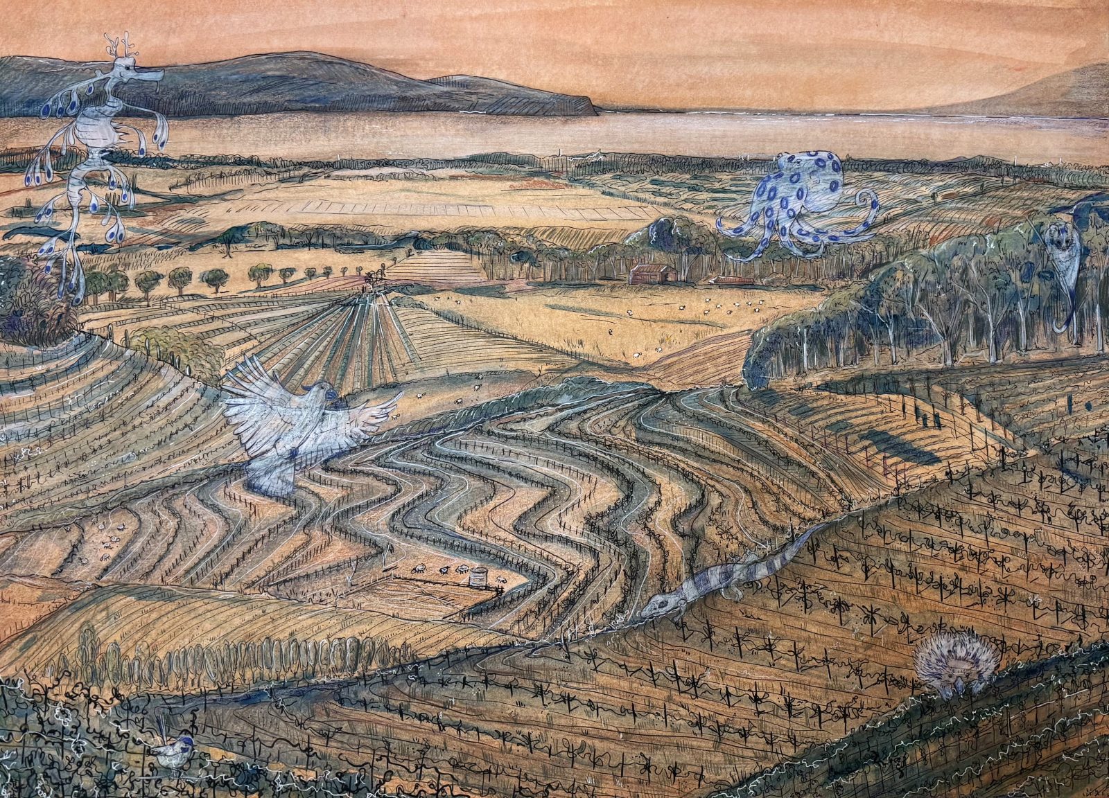 In this way, the ‘painted drawing’ becomes a meditation on vision: how we shape the land and how the land shapes us. It celebrates McLaren Vale’s past and present while reaching toward a future horizon that is defined by resilience, creativity and deep ecological connection. It is not only symbolic of a meeting point between earth and sky, but as a threshold between what is and what could be.