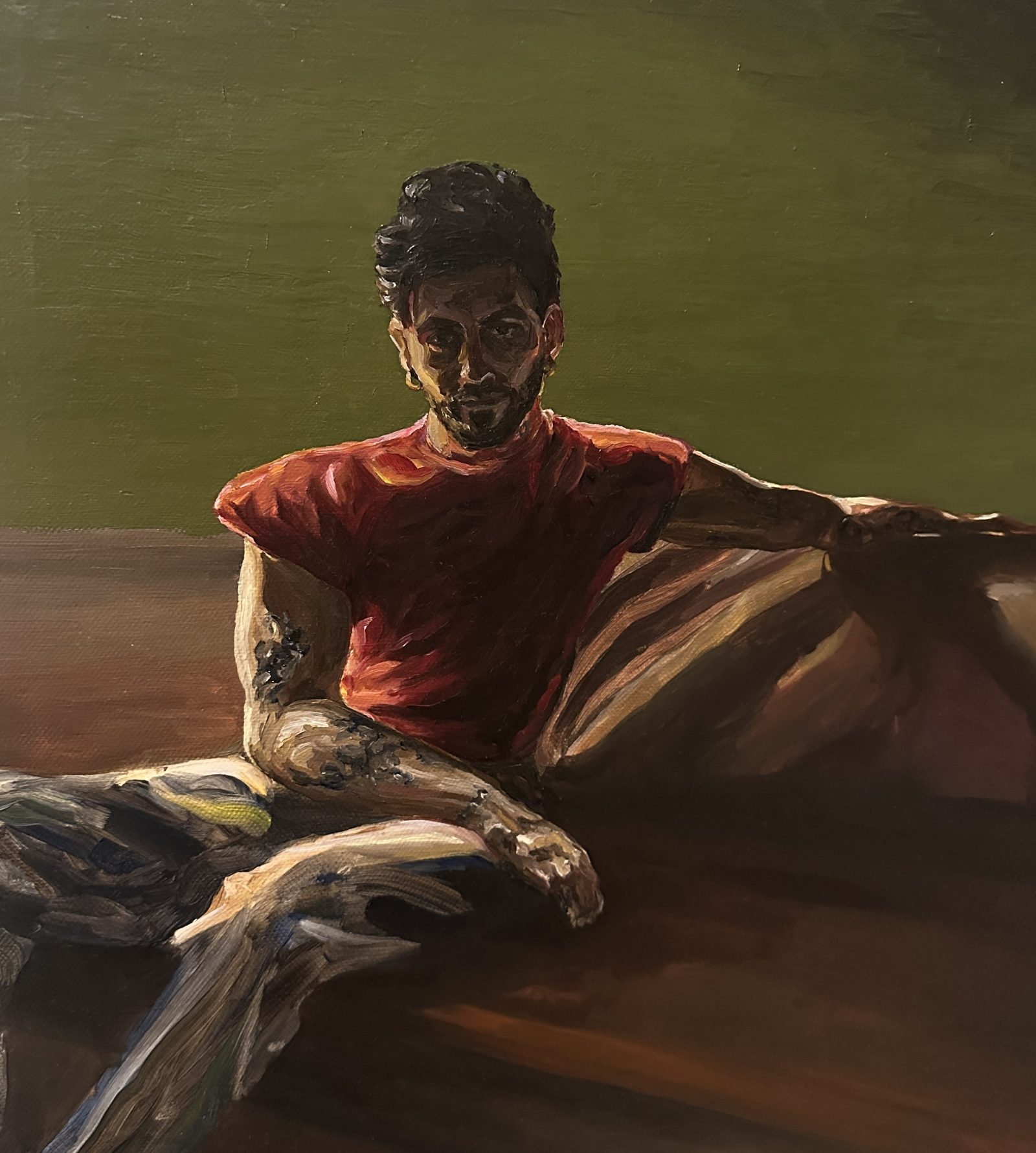 “The warmth and intensity of the McLaren area are standout qualities – a very inviting region with bountiful harvests, but simultaneously wild weather and unforgiving hills, proving to be popular amongst training cyclists. Nicko stares with quiet intensity, but with a slight smile – as if still inviting you to join. Heavy use of the more natural burnt sienna and raw umber pigments give the soft warm shadows an inviting quality, also forming the horizon of the painting directly across the midline – reflecting the divisions of the earth vs vines, hills vs trees, and natural buildings vs country greenery of the region. The tight detailed work of his tattoos contrasts against the relaxed chaos of the brushwork on his well-worn denim jeans – similar to those worn by local winemakers and residents; a similar contrast to the current day blend of traditional winery practises fused with the modern people, events, and marketing that keeps McLaren Vale relevant and thriving.”