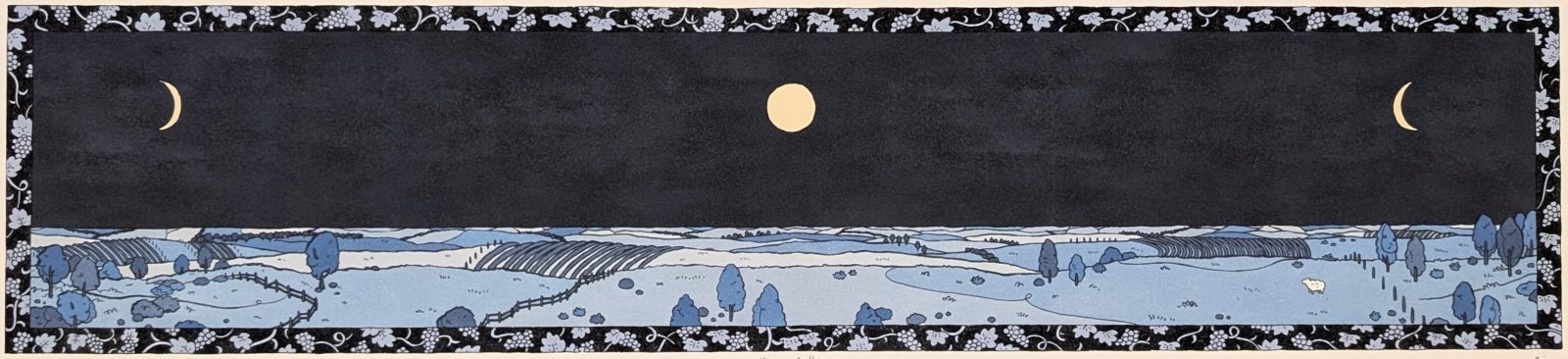 “Horizons draw me in, and I make drawings of them which may become paintings or prints. Every horizon is a place of stillness and possibility. The title of this work is an enduring memory of the words my son used to exclaim with wonder and delight when he was little and came to wake me up. It’s also about dawning mornings, surfing mornings, farmers market mornings, misty mornings, and those when, for a moment, the sun lights up a tree.”