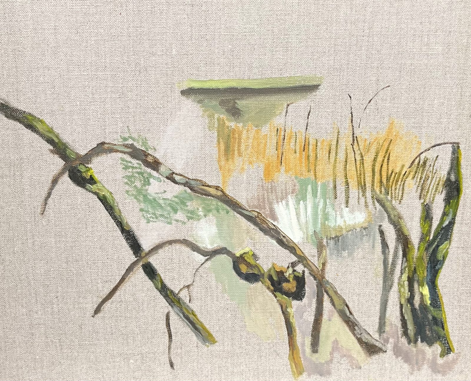 “This work was painted sitting at the side of a waterway. For me, painting en plein air fosters a valued connection with nature. A parred down aesthetic is used to evoke a contemplative interaction. The natural elements are distilled to clarify their physical presence and symbolic significance. The horizon line sits centrally and elevated, providing a steadying visual focus and holding aspirational energy. At ground level the mossy, gnarled tree line holds old time. The natural world has within it ways to guide us as we go forwards.”