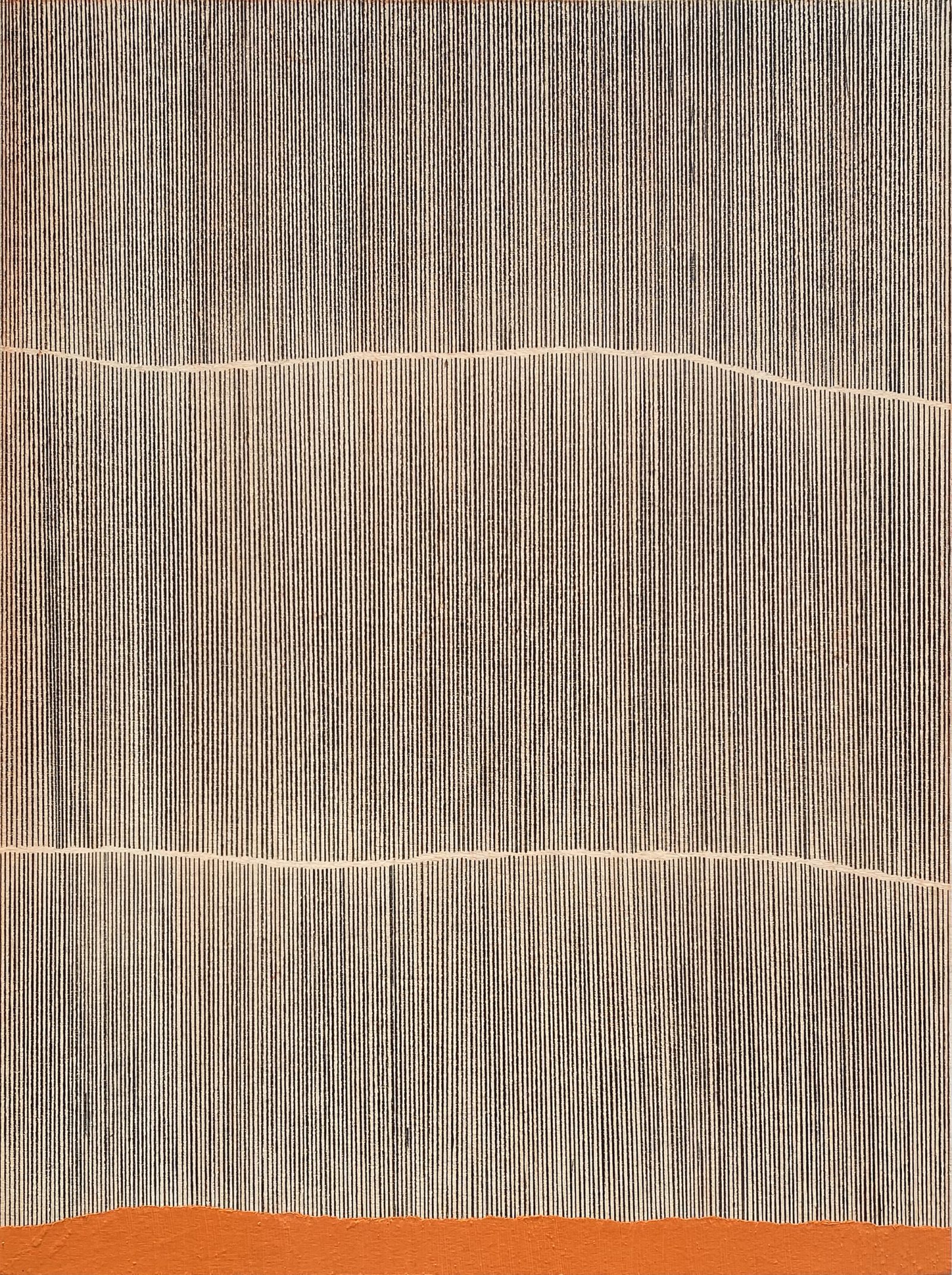 “Through the language of line, this work presents a striation of finely drawn lines, tracing down the surface to meet with dual horizons. Representing both a physical and metaphorical gesture; lines as elemental mark-making to echo the contours and rhythms of McLaren Vale’s iconic landscape, and the human impulse to seek, define and dream beyond constructed limitations.
