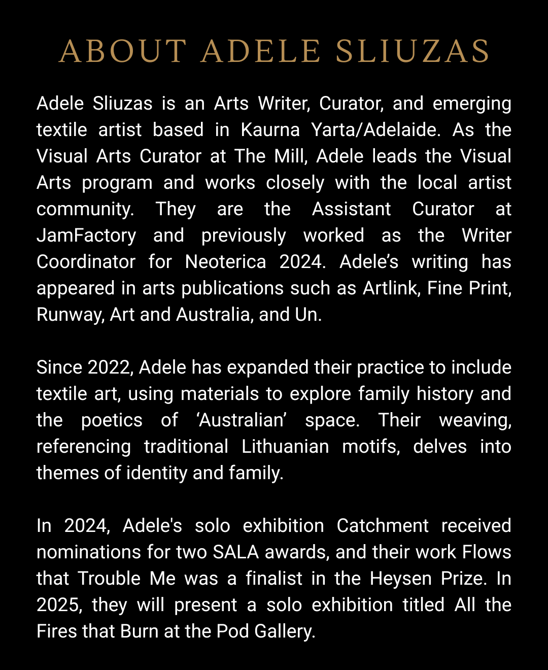 Adele Sliuzas, Arts writer, curator and emerging textiles artist, The Mill Adelaide